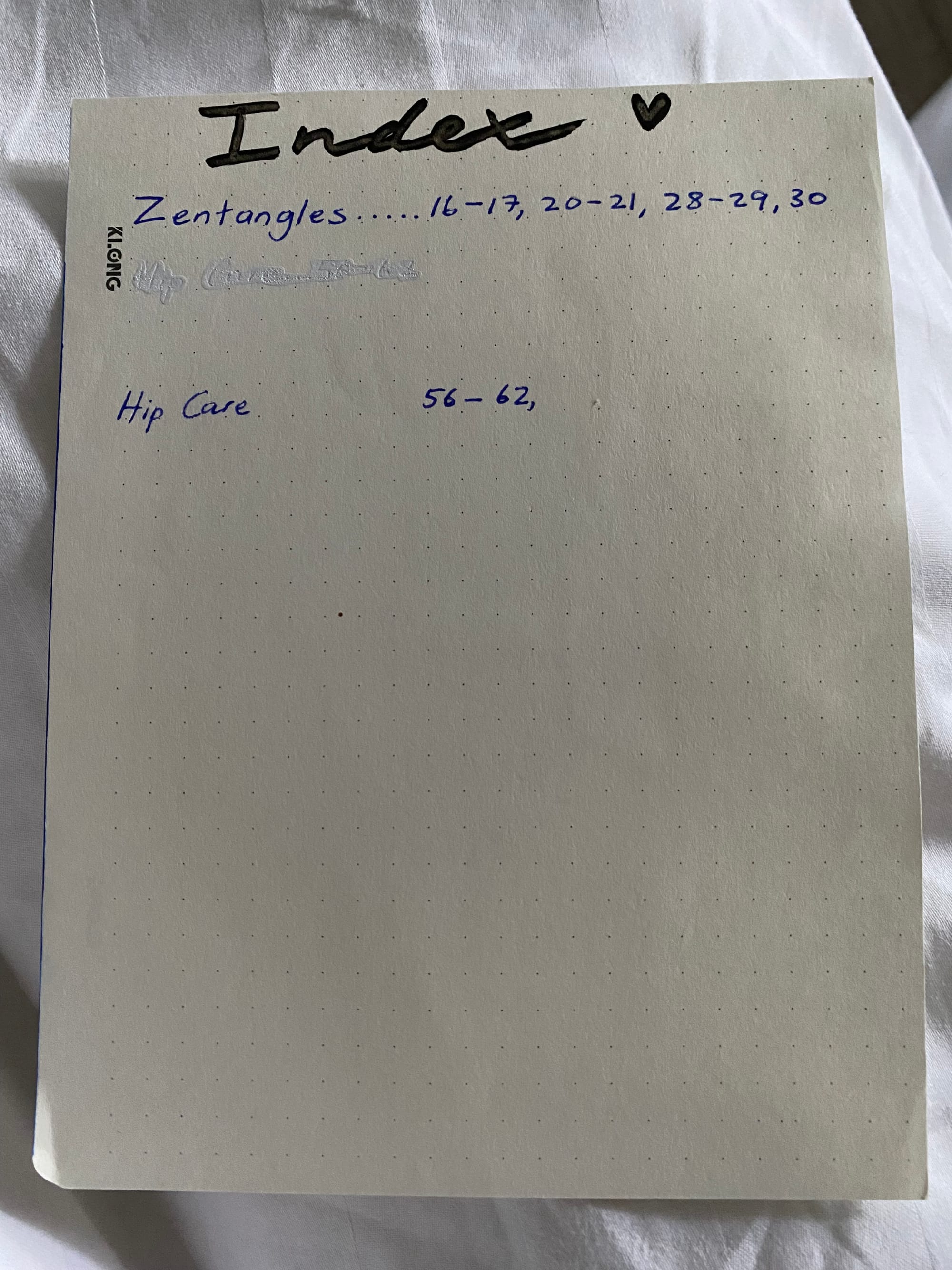 I made a pretty index page on a separate piece of paper and decided to only put in the things I would need to find again. For example, I had a “Zentangle” topic because I knew I would want to find the zentangle patterns again and often.